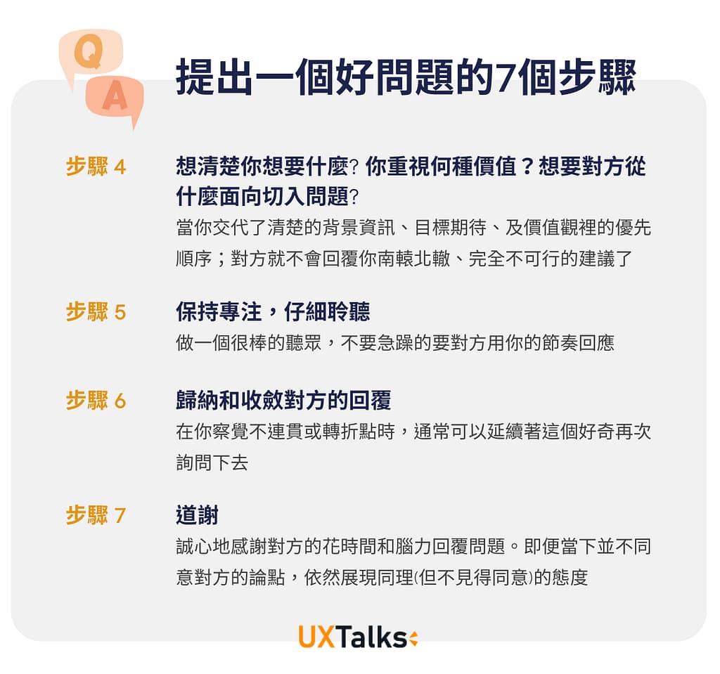 - 一次只問一個問題: 當問題的數量比較多時,先釐清問題和問題之間的關聯性,排出先後順序。